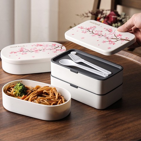 กล่องอาหารกลางวันลายดอกซากุระทรงวงรีพลาสติกสีขาวสวยสองชั้นสำหรับผู้หญิงออฟฟิศ